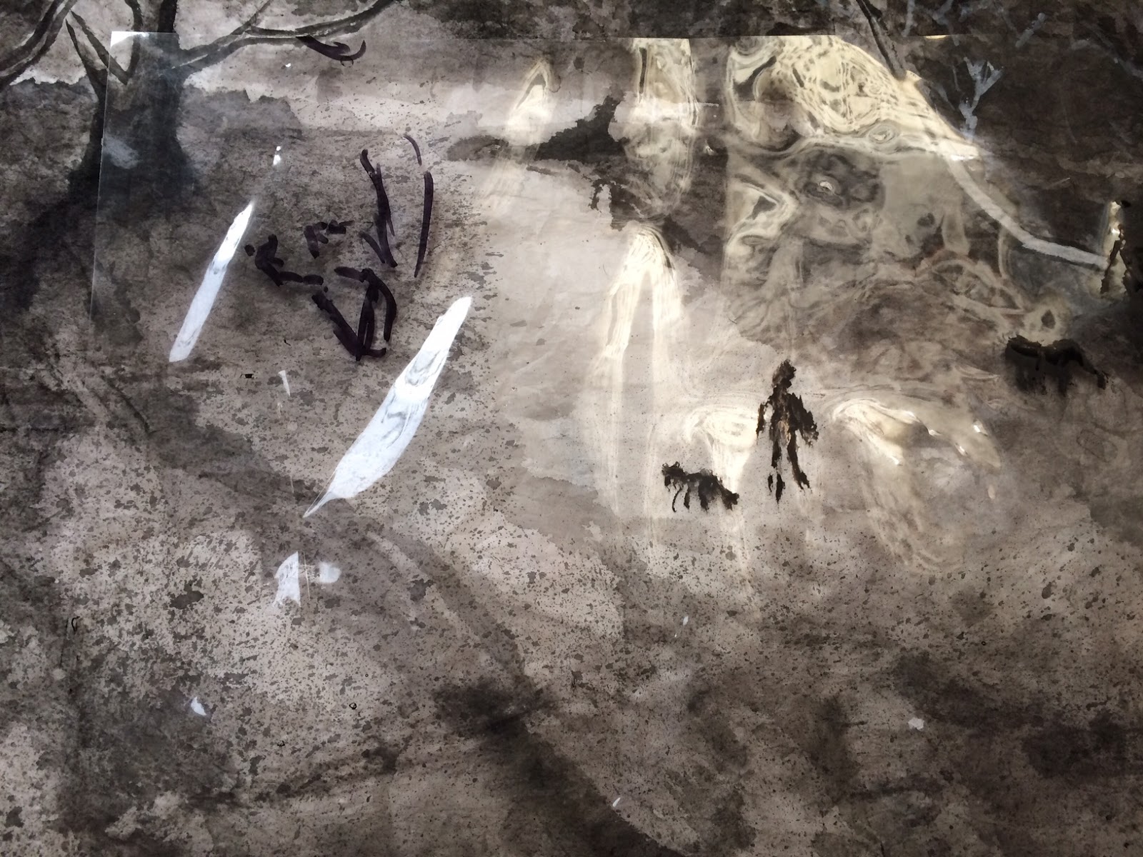 Using light ink, I wrote in the tree that was not colored in the original painting. The fact that Master Zhang left this tree untouched was interesting, as if he wanted us to see his creative process; this along with the faint sketch lines he made of trees and contours towards the upper middle part of the painting. I also utilized the light ink to loosely dab in the shaded areas of the precipitous, making it easier to identify the tucked in areas.